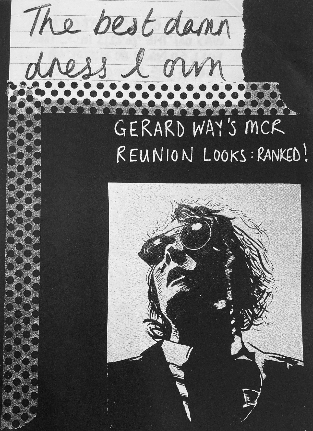 A cut n paste, black n white fanzine ranking my personal top 20 Gerard Way outfits from the 2022/23 reunion tour. Each look is illustrated with breathless accompanying commentary. Featuring all yr favs: cheerleader, spy, catboy, pool boy and more!